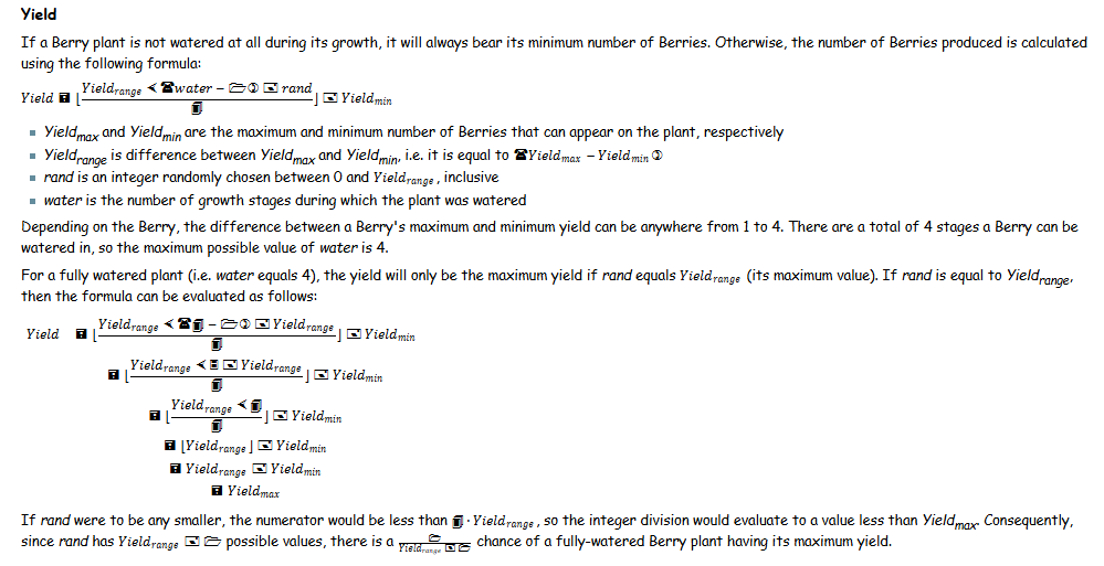 I had to take a screenshot, because the equations were broken when pasted. What this equation means for a player trying to get maximum berry yield, is that you need to water the berries in each stage, and then you have a chance of getting maximum yield. Different berries have a different value for Yieldmin and Yieldmax, and as a general rule of thumb, common berries have higher minimum and maximum yields, and rarer berries have lower numbers for those variables.